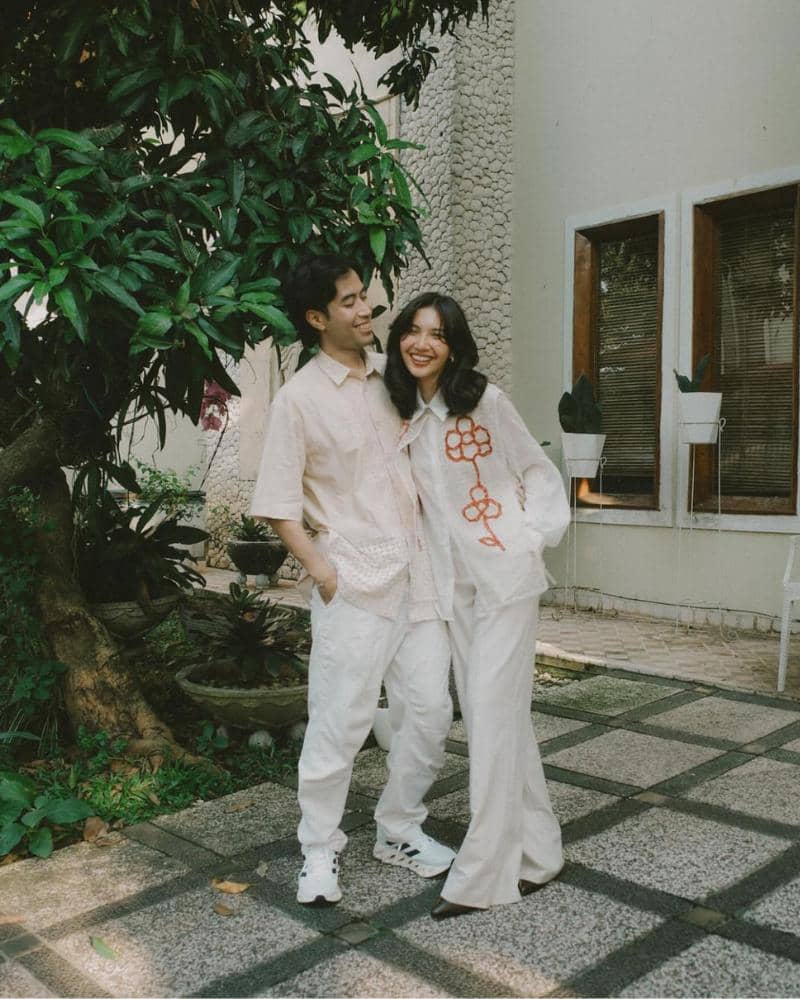 Sedangkan, suami Alika mengenakan atasan berupa kemeja, dengan motif dan warna yang sama. Kemeja ini menampilkan kerah berdiri klasik, sehingga menambah kesan rapi. Ia memadukan atasannya dengan celana kain berwarna cokelat, seolah memberikan tampilan yang terlihat nyaman.