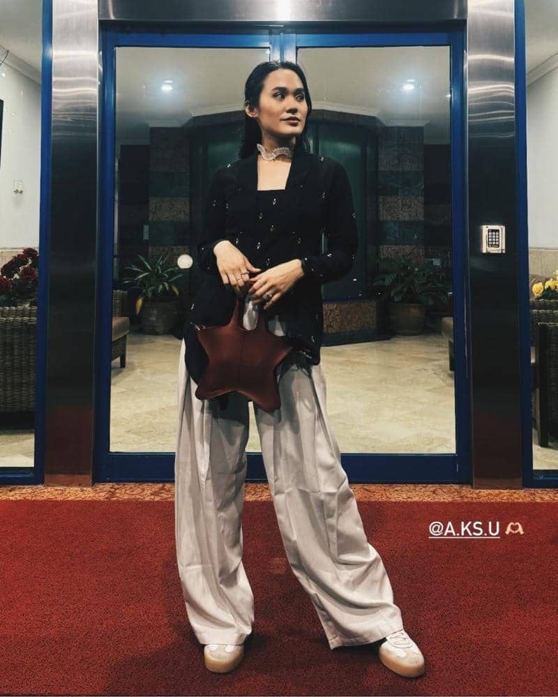 Sedangkan untuk bawahannya, penyanyi sekaligus aktris ini menggunakan celana lebar berwarna krem yang ia pasangkan dengan kalung berbentuk unik dan tas bintang, serta dilengkapi dengan sepatu sneakers putih. Seolah memberikan style anak muda yang trendi.