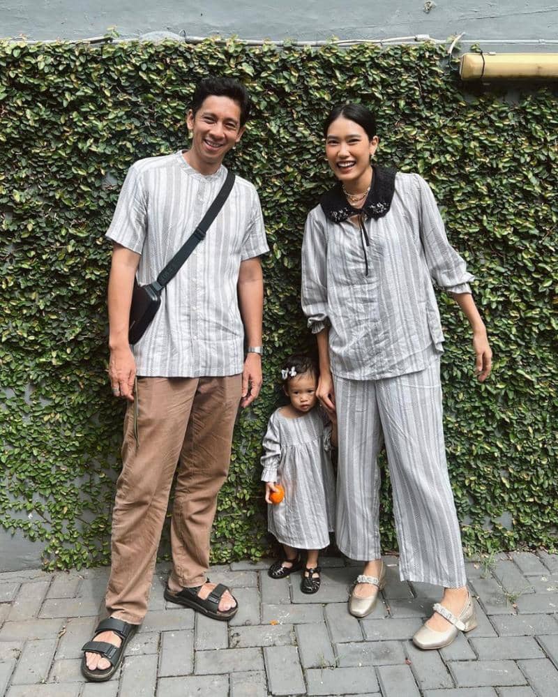 Menggunakan busana hasil kolaborasi SARE STUDIO dan PVRA seri Harmony, Alika Islamadina terlihat kompak dengan keluarga yang memakai motif yang sama. Outfit bermotif garis-garis dengan warna abu dan putih, menghiasi keluarga kecil Alika.
