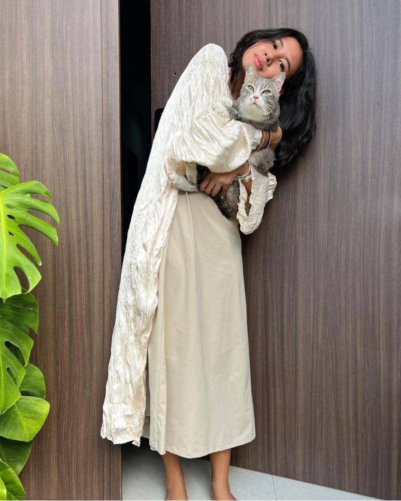 Ia mengenakan rok panjang berwarna cokelat terang, diikuti kardigan panjang dengan bahan yang unik, yang terlihat puffy. Bahan yang sedang digunakan oleh banyak anak muda zaman sekarang.