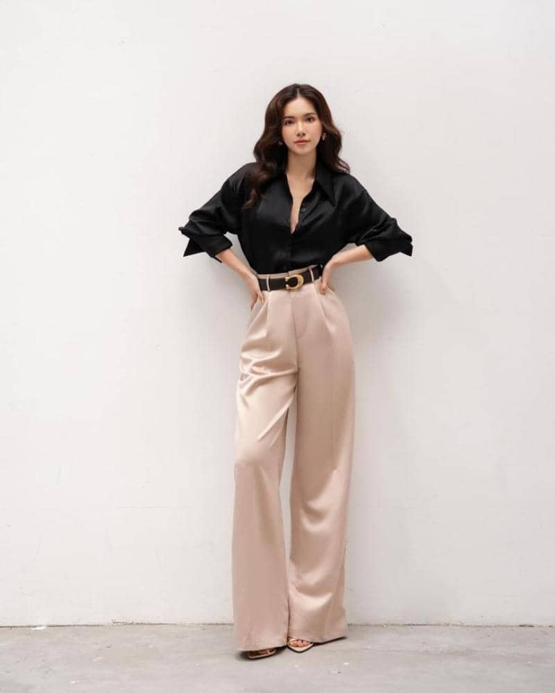 Bagi Mama yang ingin tampil sesuai busana kantor pada umunya, kamu bisa padukan kemeja dengan efek kilau ala kemeja satin, dengan trousers yang glossy. Paduan bahan membuat tampilan premium, sementara warna hitam dipadukan dengan champagne buat kamu terlihat mewah.