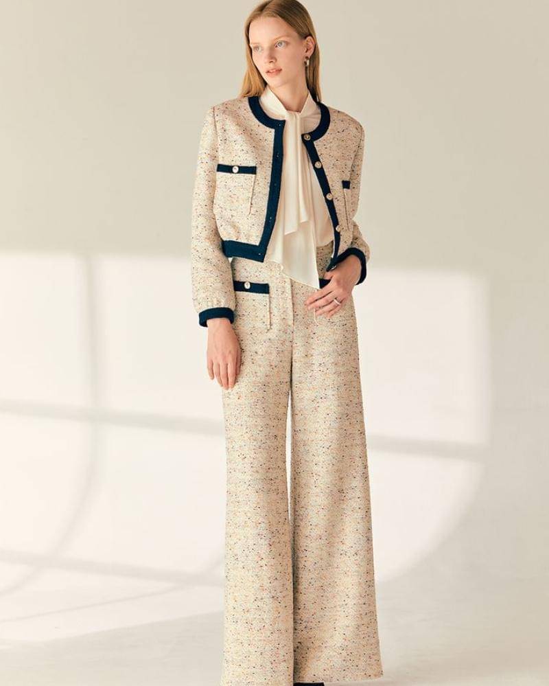 Mengenakan setelan adalah cara meningkatkan penampilanmu dengan mudah. Pilihlah setelan crop jacket dengan celana panjang yang melebar. Jika, jaket dan celana memiliki pola atau tekstur itu adalah poin tambahan bagi penampilanmu.