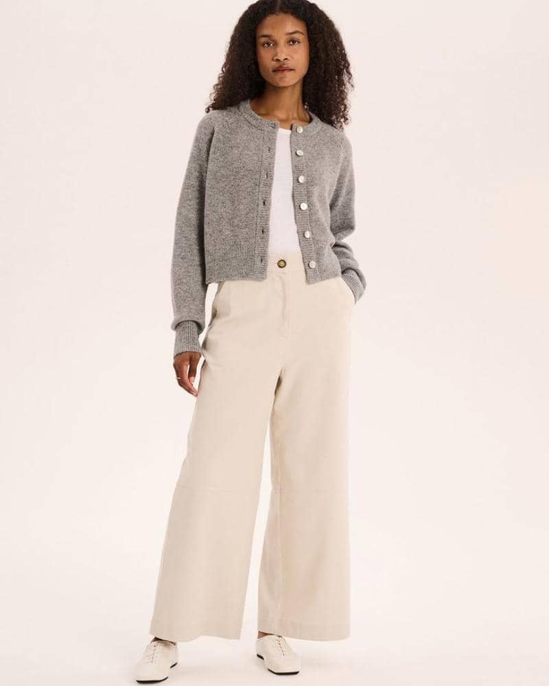 Cocok untuk kamu kenakan ke daerah bercuaca dingin, coba kombinasikan kaus atau tank top polos dengan cardigan berbahan wool yang memberikan kehangatan ekstra, dan detail tekstur yang menawan. Tambahkan celana panjang bergaya ala kulot, dengan ciri khas bagian bawah kaki yang melebar.