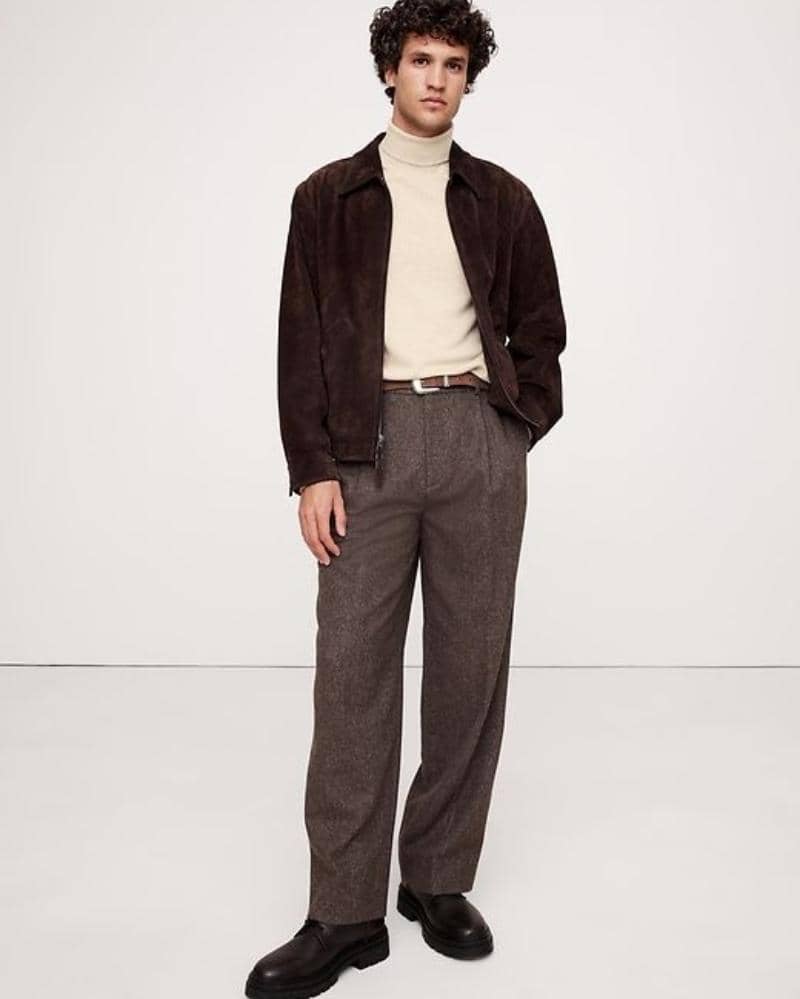 Nah, pilihan mix & match busana yang satu ini bisa buat kamu tampil kece, di depan pasanganmu. Paduan turtleneck berwarna krem, dengan celana panjang cokelat bertekstur, dilapisi jaket berkerah suede, is a perfect ensemble!