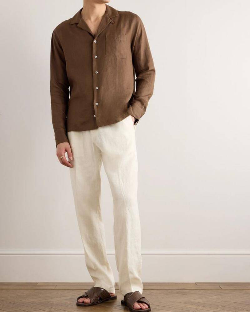 Nah, kamu bisa padukan kemeja berkerah santai, dengan bahan yang adem, dengan celana panjang berbahan linen maupun katun. PIlihan warna yang membumi seperti pada potret ini, memperkuat kesan santaimu. Apalagi, ditambah sandal yang menjadi pelengkap penampilan.
