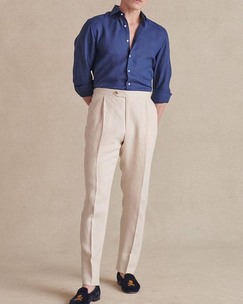 Ia memadukannya dengan celana panjang linen dengan bagian pinggang yang cukup tinggi, disertai model kancing yang unik. Penggunaan bahan linen memang merupakan pilihan umum untuk celana panjang berwarna terang karena sifatnya yang menyerap keringat dan sejuk, membuatnya cocok untuk cuaca hangat atau tampilan santai namun berkelas.