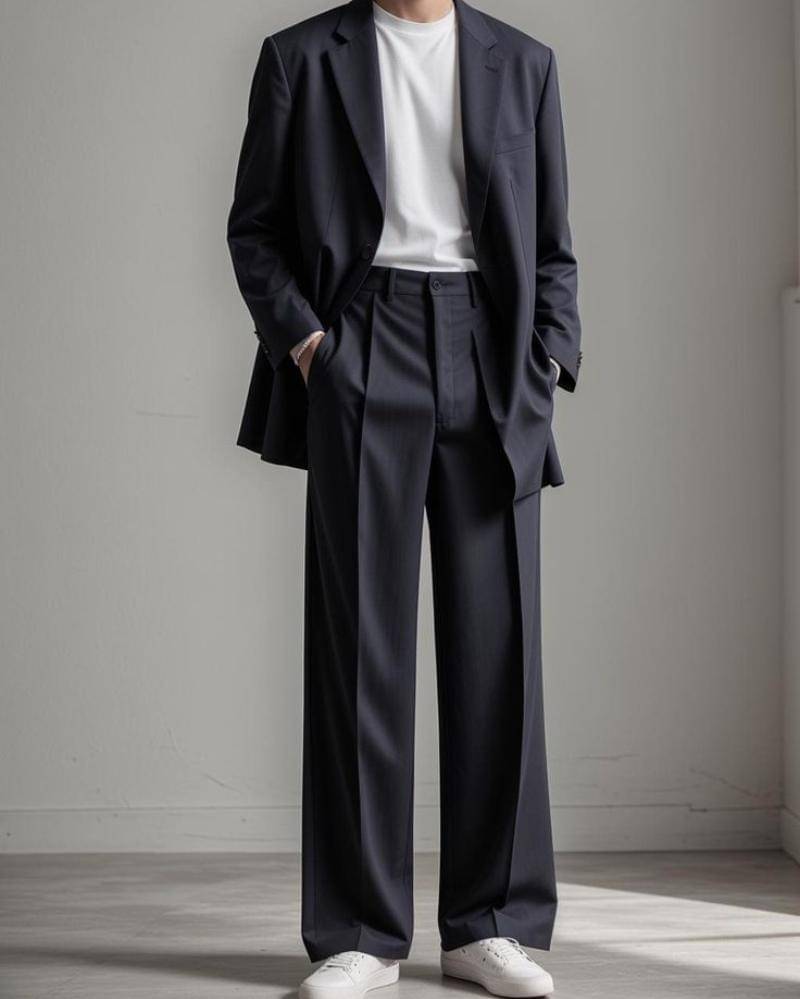 Nah, untuk menggunakan gaya ini, pastikan Papa memiliki jas dengan ukuran oversize dan mix & match dengan kaus polos. Lalu, tambahkanlah celana panjang yang cukup longgar, dengan warna yang cocok pada jas.