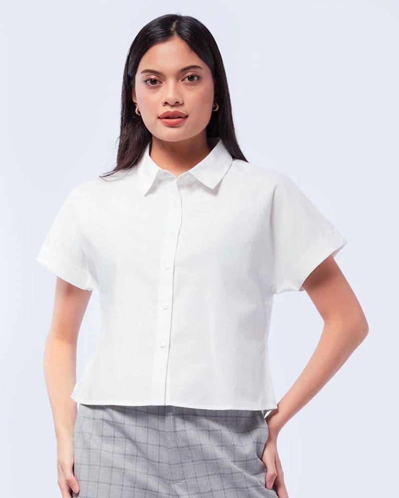 Blus klasik ini dibuat dari kain oxford yang berikan tampilan menawan. Dilengkapi dengan garis leher berkerah, lengan pendek dengan detail roll-up, memberikan gaya chic yang berbeda dengan kemeja pada umumnya.