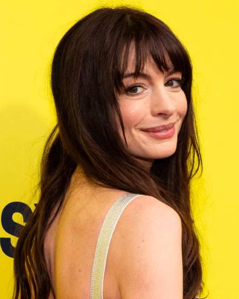 Kombinasi antara poni dan rambut panjangnya membuat tampak menggemaskan sekaligus polos. Warna rambut cokelat juga sepertinya sangat cocok untuk Hathaway kali ini, warna ini melengkapi penampilannya dan terlihat cocok dengan gaun yang ia kenakan.