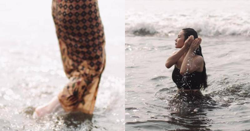 Dalam momen penuh kedamaian itu, ia tampil anggun mengenakan atasan kemben hitam yang sederhana namun elegan, dipadukan dengan kain batik yang melilit sebagai rok, menciptakan penampilan yang sangat alami dan penuh nuansa tradisional.