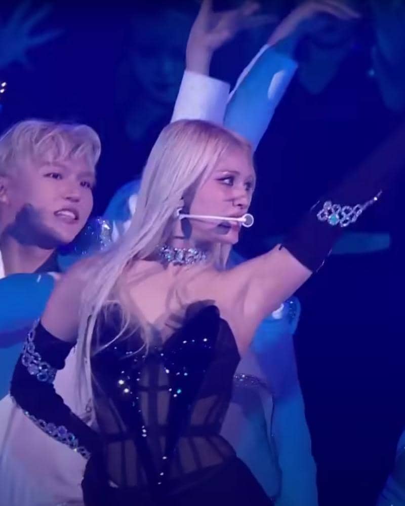 Ia menghadiri red carpet dengan elegan, memakai dress hitam, membuatnya bagaikan angsa hitam. Tetapi, ia kemudian memberikan penampilan dengan gaya yang sangat berbeda, meninggalkan kesan yang kuat. Ia mengganti gaya busananya, mengenakan bustier top yang menunjukkan beberapa bagian tubuhnya, diikuti bawahan berupa celana ketat, serta heel boots berwarna hitam yang berkilau.