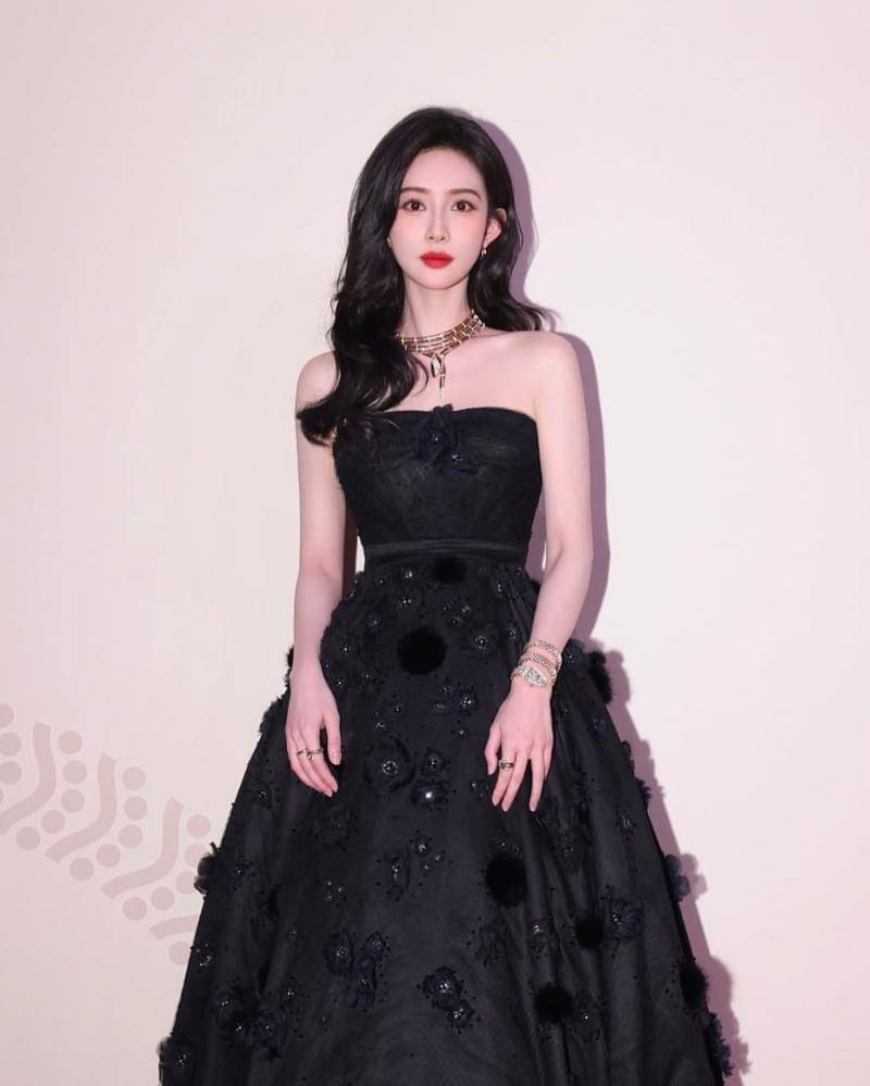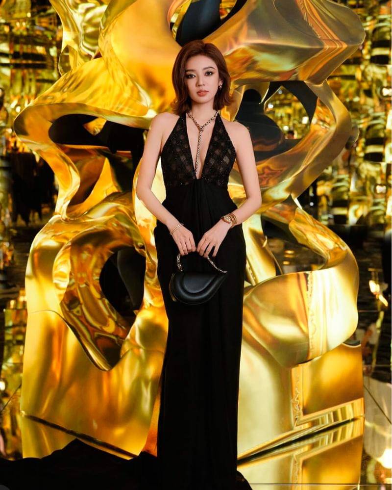 Li melengkapi tampilannya dengan sepasang celana dan sepatu pantofel berwarna hitam, serta perhiasan dari koleksi Serpenti. Ia mengenakan cincin dan gelang berwarna emas yang dengan sempurna menghiasi dirinya.