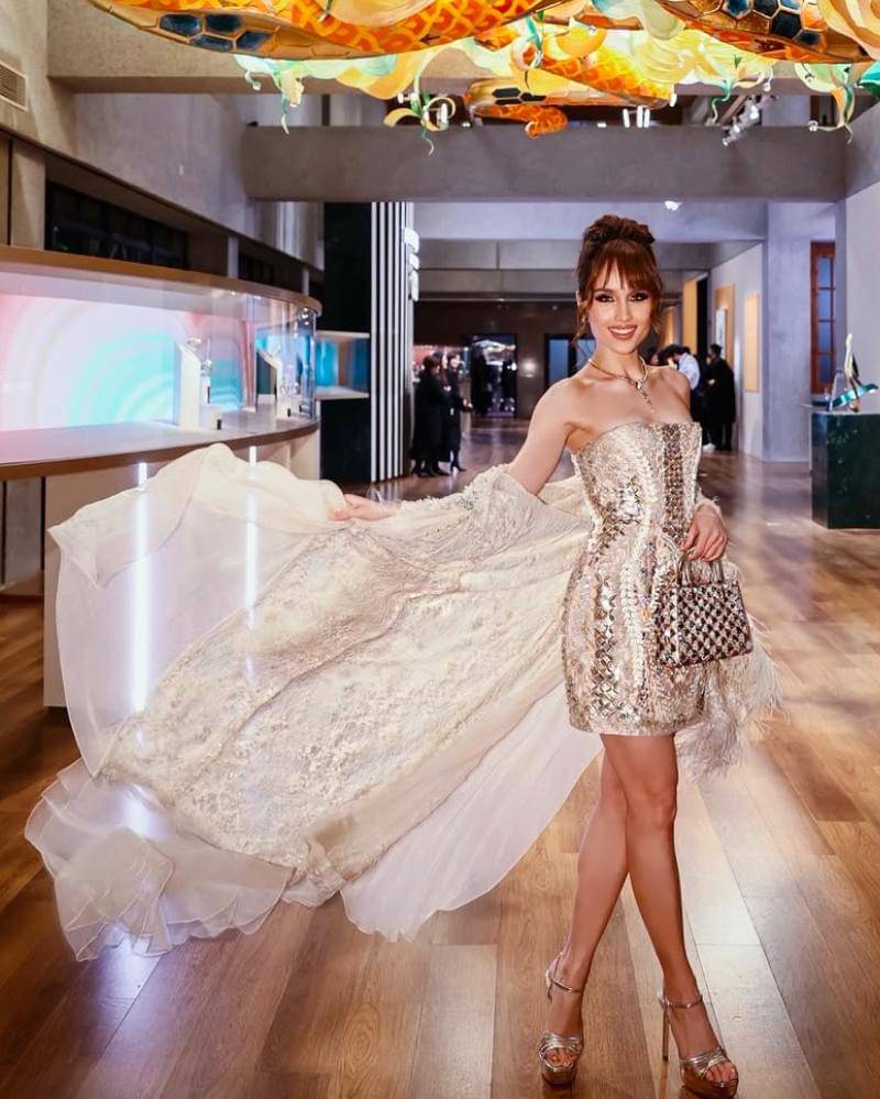 Kesan dramatis semakin terlihat dari gaun yang memiliki jubah atau cape, yang Cinta perlihatkan dengan cara mengibaskannya, pada potret yang satu ini. Ia juga melengkapi tampilannya dengan tas mini berkilauan kristal yang mencuri perhatian dan sepatu hak tinggi perak yang menonjolkan kaki jenjangnya.