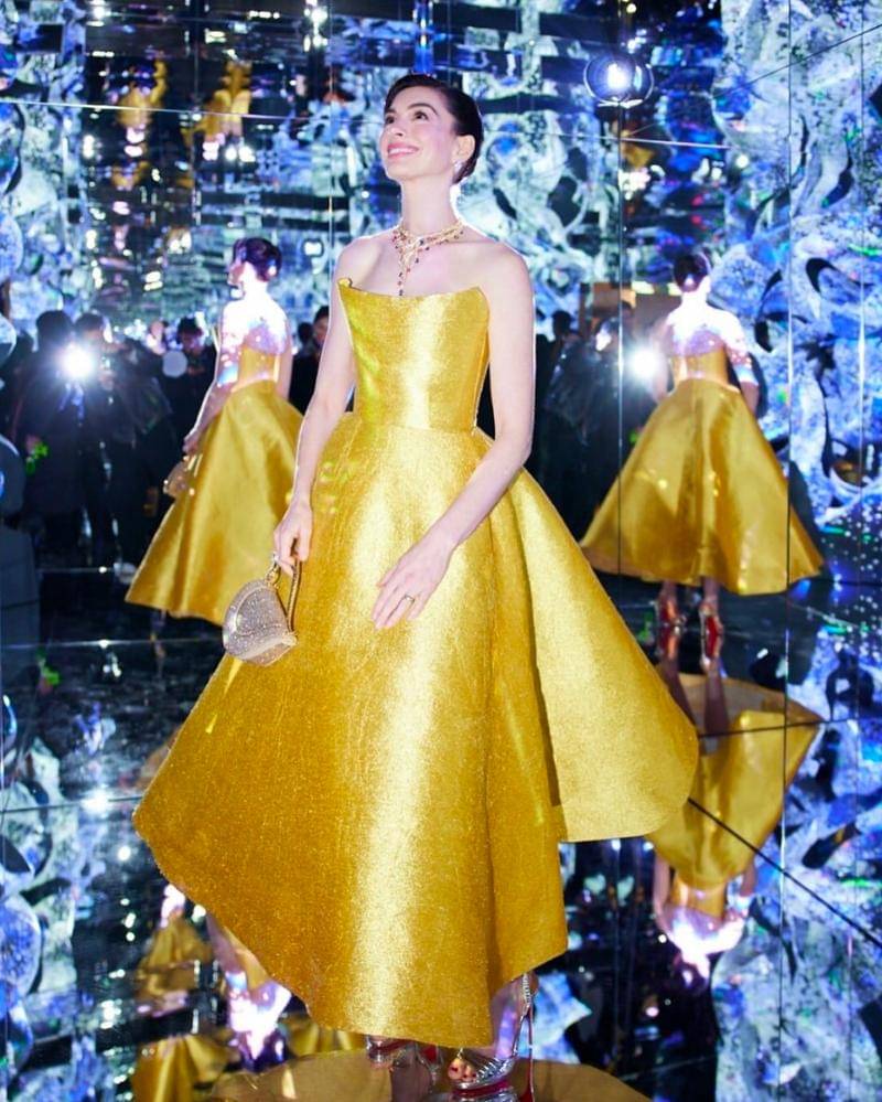 Anne Hathaway sekali lagi memikat para penggemar pada Rabu malam di pembukaan pameran Bulgari Serpenti Infinito di Shanghai, Tiongkok. Ia tampil dramatis dalam balutan gaun Oscar de la Renta emas yang memukau.