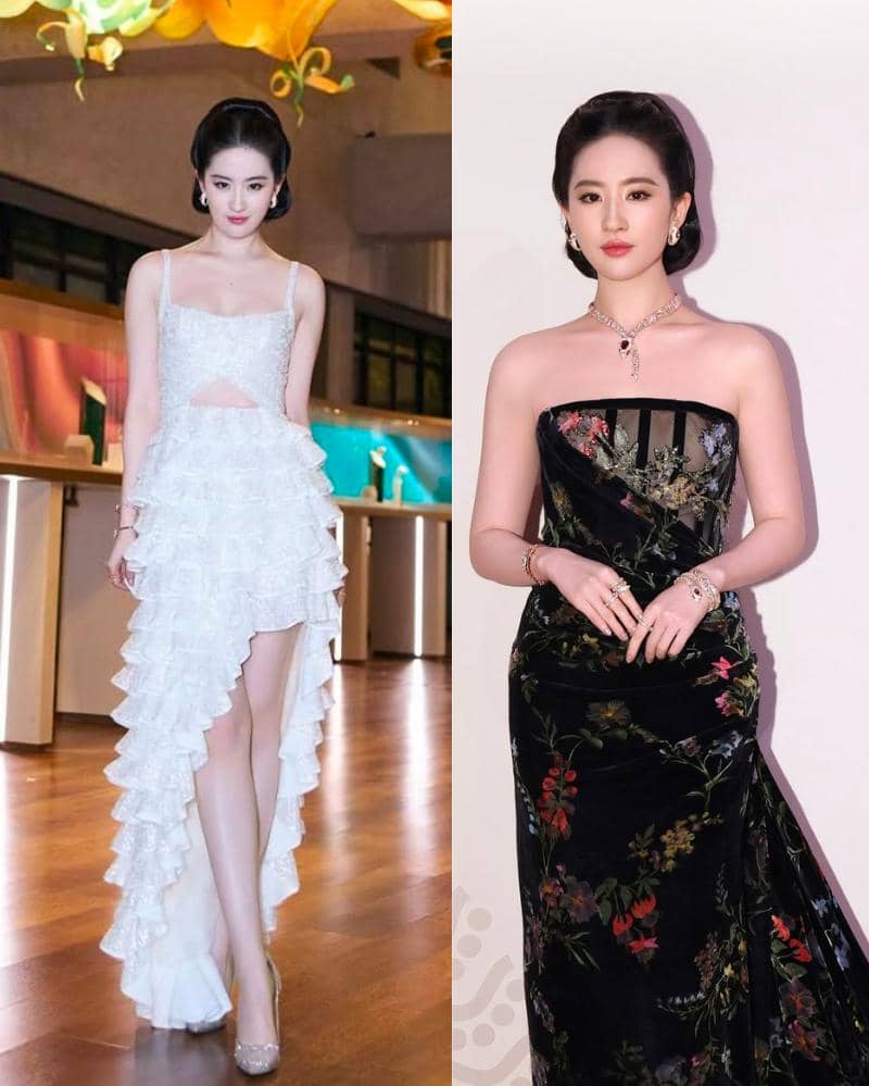 Liu Yifei juga tidak kalah dalam menarik perhatian sekitarnya. Ia mengenakan dua tampilan berbeda yang memukau, malam itu. Gaun pertama merupakan gaun beludru hitam dari koleksi Haute Couture Musim Gugur 2024 Elie Saab, melambangkan keanggunan musim dingin.