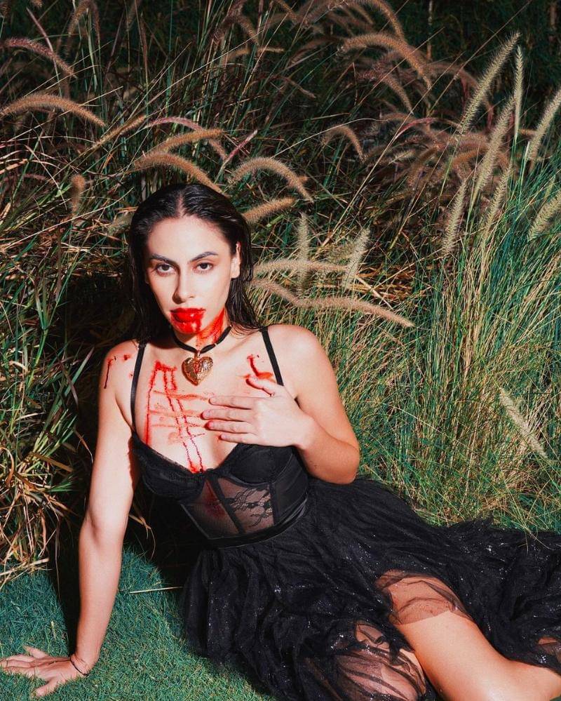 Pada leher terdapat kalung hati yang besar, sementara rambut Valerie ditata ke belakang, menunjukkan wajah, dengan lumuran darah dari mulut. Menciptakan look Halloween yang membuat bulu kuduk berdiri.
