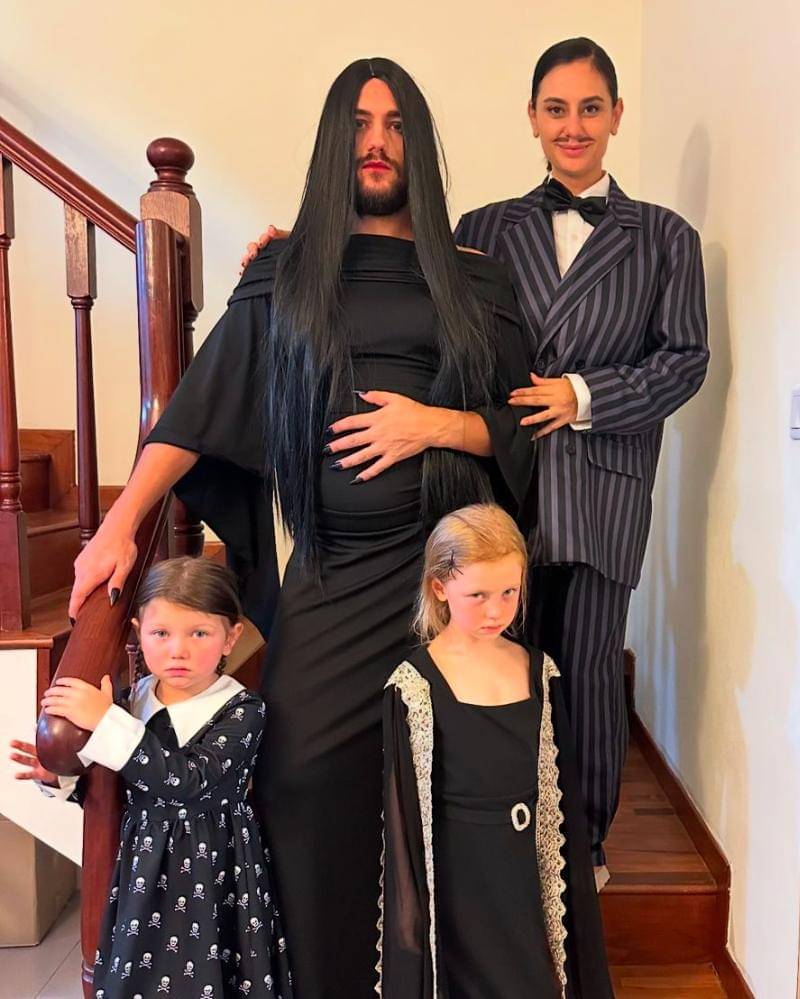 Sementara, Benedikt, sang suami, terlihat menggunakan rok panjang berwarna hitam, bergaya off shoulder, lengkap dengan wig hitam yang panjang. Kedua anak mereka juga tampil menggemaskan dengan dress berwarna hitam, busana ala Wednesday Addams.