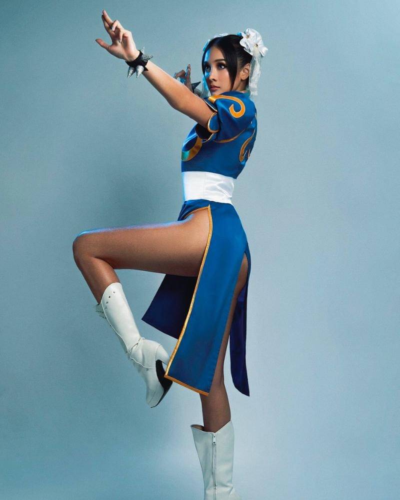Anya pun berpose di depan kamera, menggunakan gaya-gaya khas Chun Li. Cocok banget nggak, sih kostum pilihan Anya kali ini?