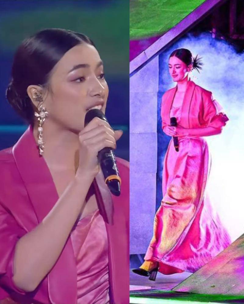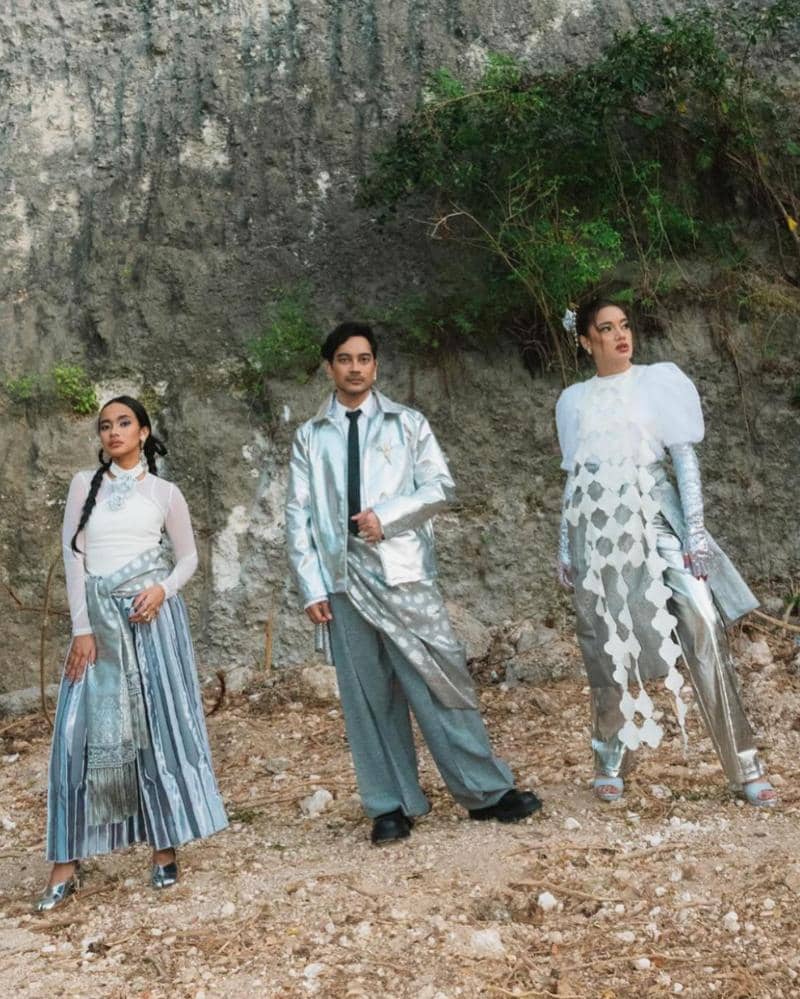 Busanaya yang dikenakan menggunakan warna perak, yang dapat berubah menjadi warna keemasan ketika terkena cahaya. Dihiasi manik-manik bulat yang membentuk pola unik, seperti kain tradisional. Pakaian bermotif tradisional digabungkan dengan desain futuristik, menghasilkan harmoni yang pas.