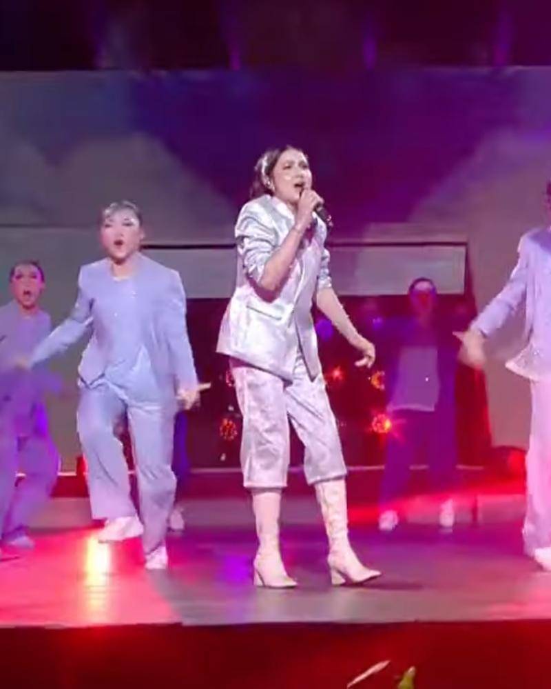 Outfitnya juga tidak kalah keren, lho. Menggunakan warna perak, outfit Bulan terkesan futuristik. Busananya terdiri dari atasan berupa blazer dengan dua kantong di bagian depan, dipadukan dengan celana di bawah lutut.