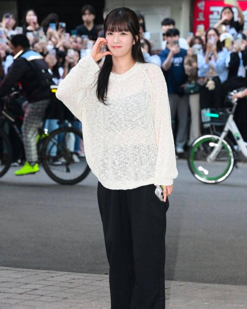 Anggota girl group Apink ini, datang menggunakan sweater rajut berwarna putih, yang semi-transparan. Ia menggunakan dalaman berwarna hitam, pas dengan celana hitam longgar, yang terlihat nyaman.