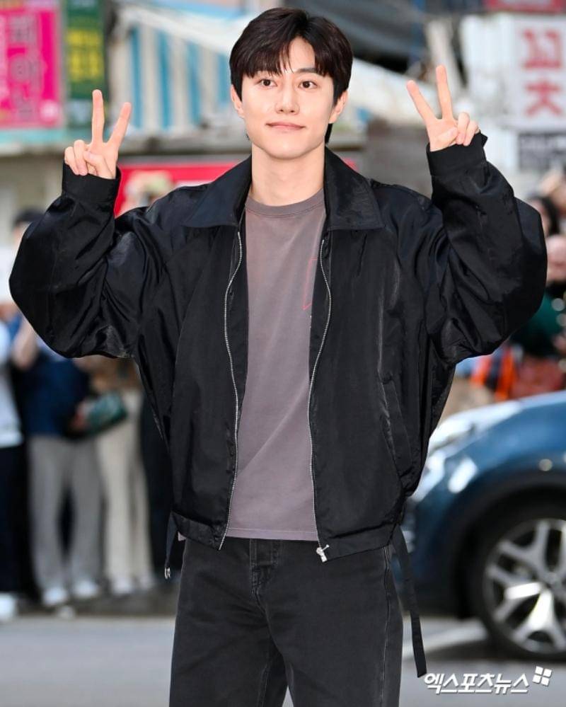 Dong Yeon terlihat menggunakan kaus berwarna cokelat yang dilapisi jaket hitam dan sepasang celana jeans hitam. Gayanya yang kasual bisa jadi ide outfit santai untuk Papa, nih!