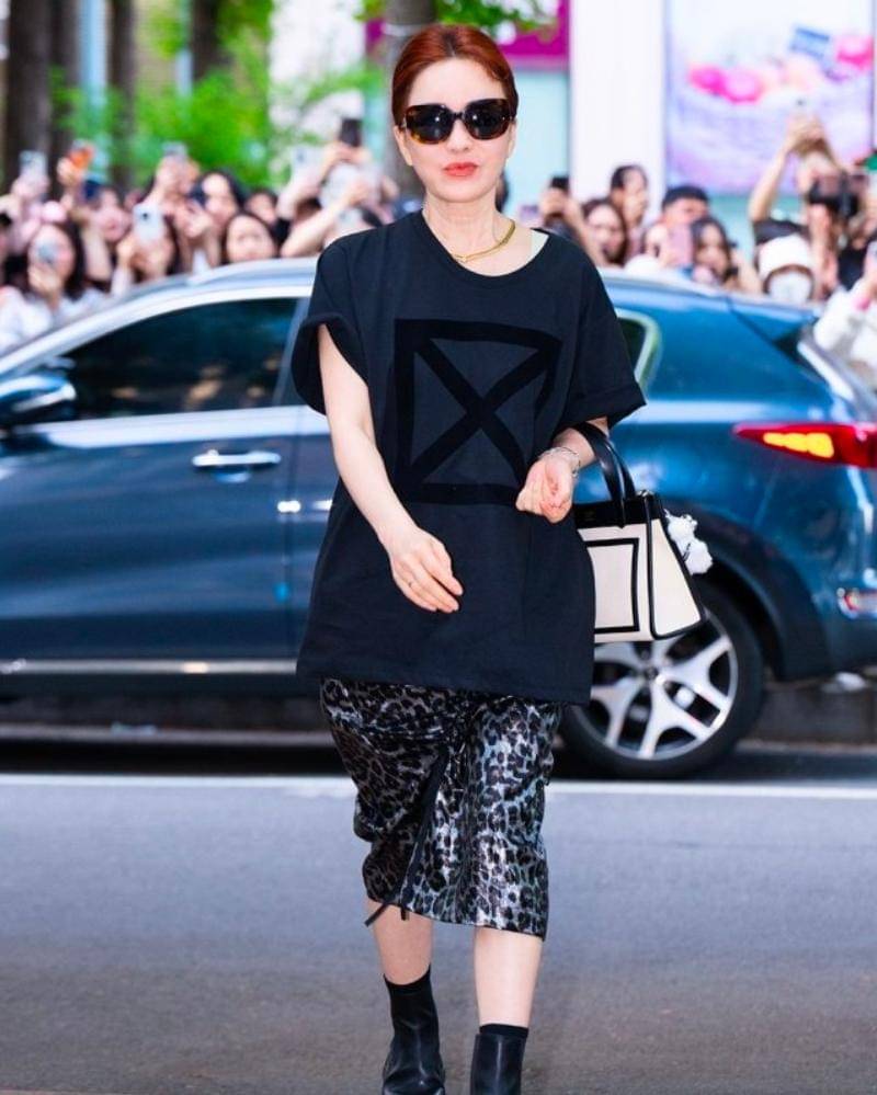 Jung Nan hadir menggunakan gaya yang cukup menonjol juga, lho. Ia memakai kaus hitam bergaya oversized, dipadukan dengan rok bermotif macan tutul. Motif yang sepertinya sudah melekat dengan dirinya.