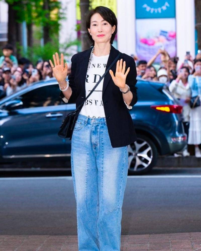 Tapi untungnya, penampilan Na Young Hee di wrap up party normal-normal saja ya, Ma. Na Young Hee tampil dengan makeup yang natural! Ia juga memakai kaus putih dengan blazer hitam, yang dicocokan dengan jeans biru.