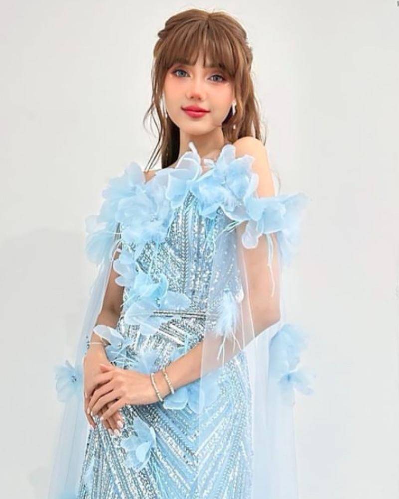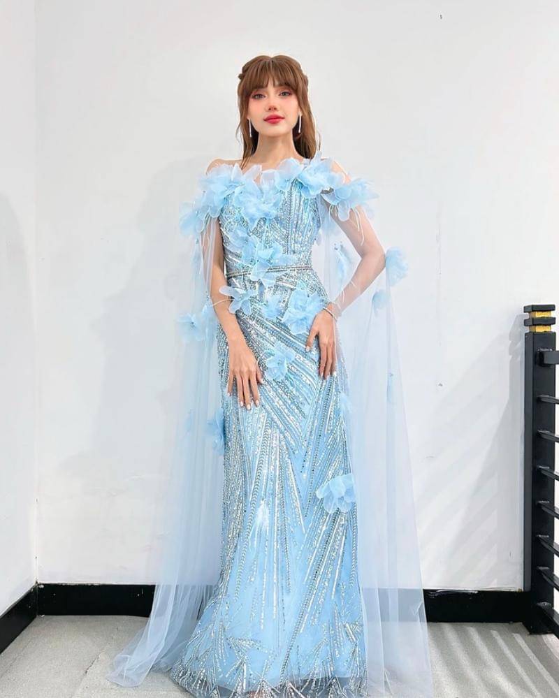 Selain itu, terdapat jahitan bunga dari kain, di sekeliling gaun Rina yang membentuk tubuhnya dengan pas. Ditambah, kain semi-transparan yang menjuntai dari bagian lengan hingga ke lantai, membuat tampilan Rina semakin megah.