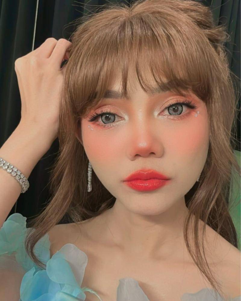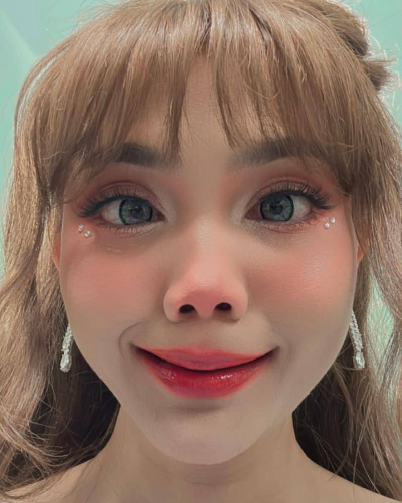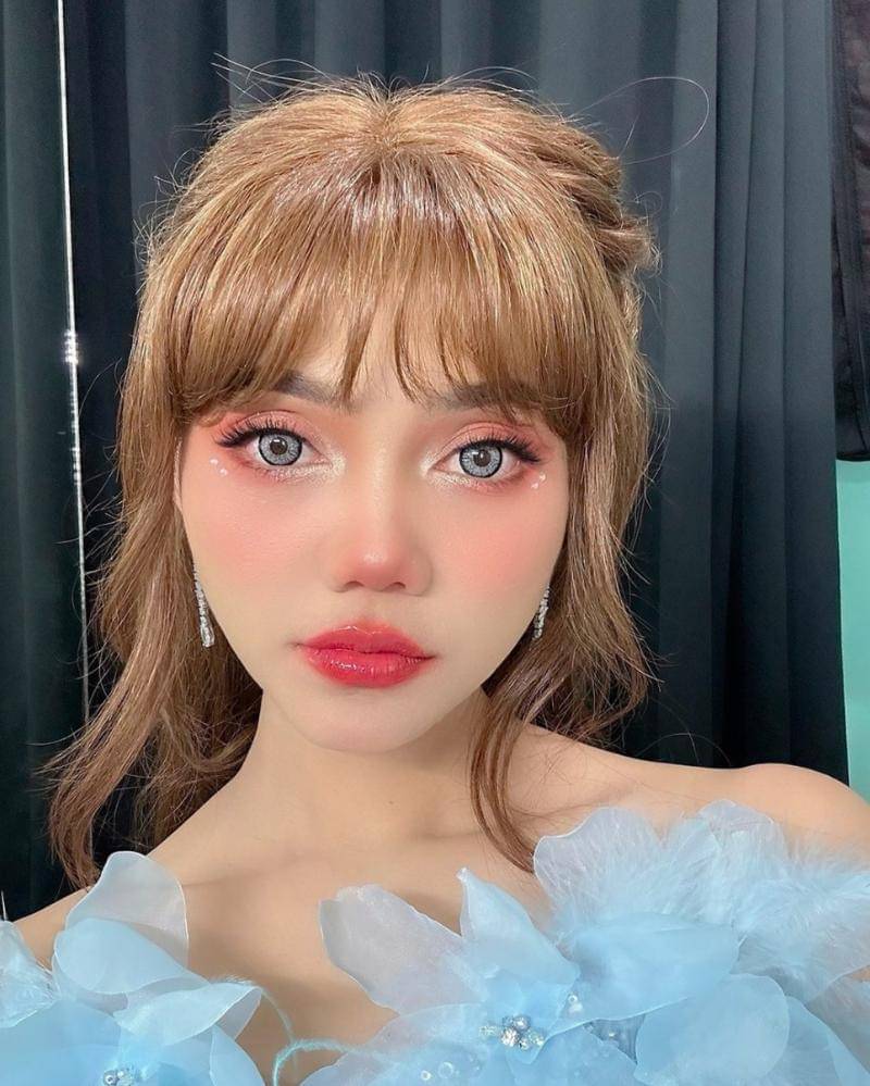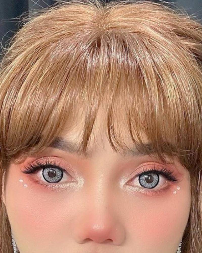 Rina juga melengkapi tampilan matanya dengan softlens berwarna biru keabuan, dengan detail ring. Sehingga, mata terkesan lebih besar dan tampilan cute ala peri semakin terpancar.