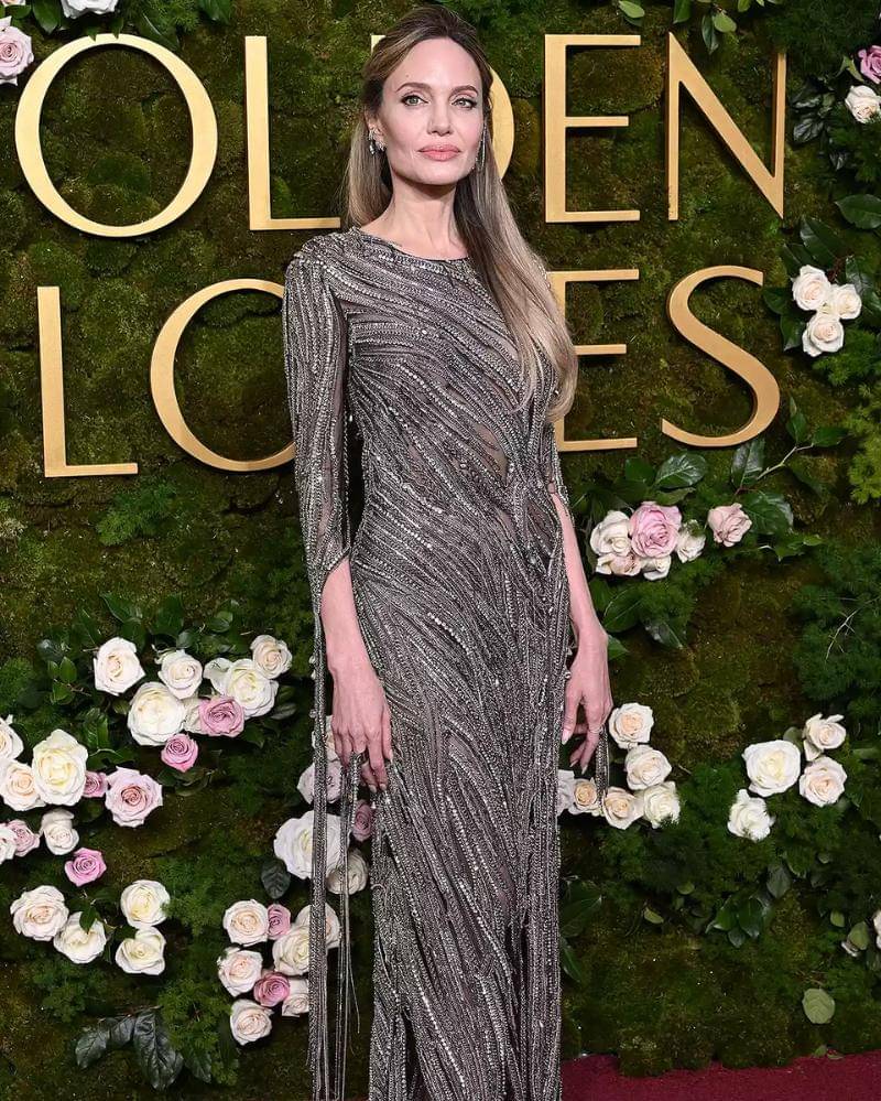 Di Beverly Hilton, Angelina Jolie tak kalah memukau di karpet merah. Bintang film hits ini mengenakan gaun karya Alexander McQueen, dengan detail lengan panjang yang memukau, dihiasi dengan garis-garis diagonal payet hitam dan perak yang memukau. Melengkapi gaunnya, ia mengenakan perhiasan Messika yang indah. Jolie turut memamerkan poni barunya dan riasan wajahnya tampak sederhana.