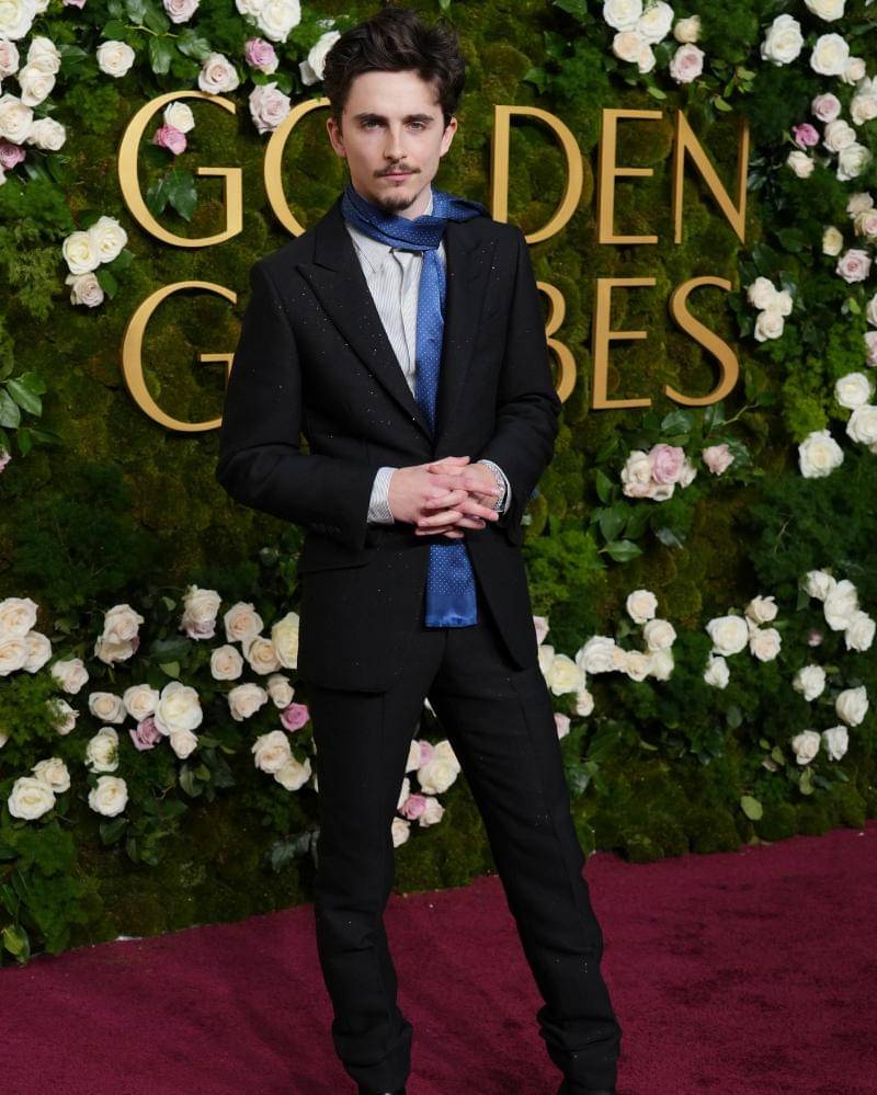 Timothee Chalamet tampil penuh gaya di Golden Globes 2025. Ia memilih gaya klasik namun khas dirinya dengan mengenakan tuksedo dari Tom Ford. Penata gaya Haider Ackerman mendandani aktor tersebut dengan tuksedo hitam yang anggun dengan detail payet hitam halus untuk sentuhan gemerlap.