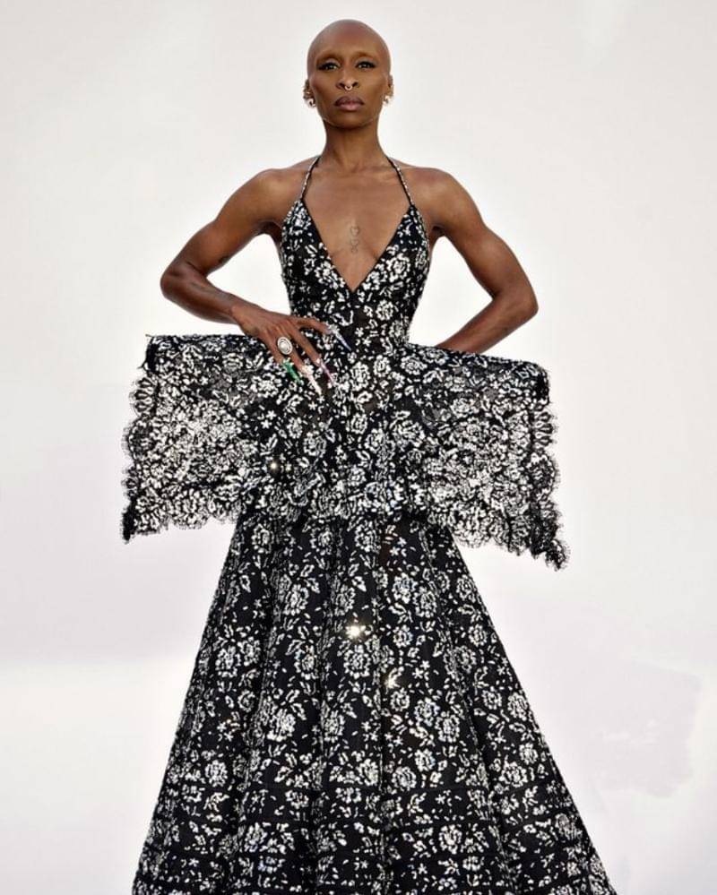 Erivo tampil memukau di acara tersebut, mengenakan gaun hitam Louis Vuitton yang dramatis. Gaun tersebut menampilkan siluet yang bervolume dari bagian pinggang ke bawah, dan dihiasi dengan pola perak metalik yang mencolok. Sementara, leher berbentuk V menjuntai secara dramatis, berpuncak pada peplum berlekuk yang semakin menonjolkan bentuk tegas dan dramatis gaun tersebut.