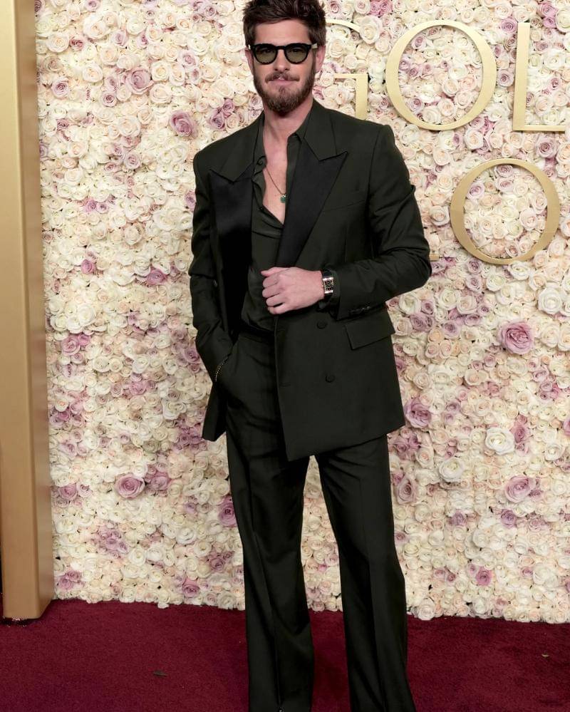 Meskipun tidak mendapatkan nominasi apapun di Golden Globes kali ini, Andrew Garfield, tampil penuh gaya di acara penghargaan tersebut. Ia hadir sebagai salah satu MC, dengan mengenakan setelan jas hijau Gucci yang anggun.