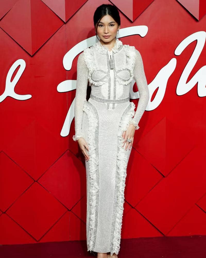 Kali ini, Gemma Chan kembali ke karpet merah dengan penampilan yang sangat anggun. Ia mengenakan gaun panjang berwarna putih, dengan desain yang unik. Karya Self-Portrait x Christopher Kane ini, memiliki detail ruffles pada bagian leher sampai ke bagian ujung gaun, seolah membingkai dress satu ini. Sementara itu, gaun satu ini juga terlihat berpola jaring.