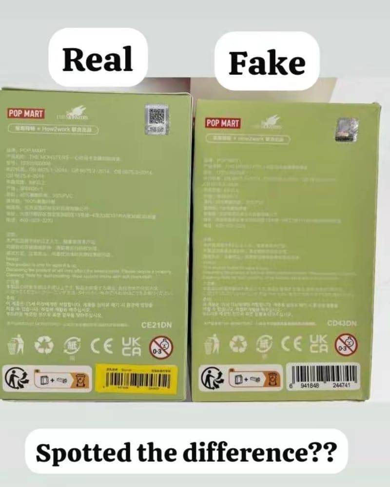 Perbedaan selanjutnya adalah Labubu yang asli dilengkapi dengan barcode pada kemasannya, yang mengarahkan ke website, sedangkan yang palsu tidak memiliki barcode tersebut. Namun, juga terdapat labubu palsu yang ada bercodenya tetapi bercode tersebut tidak bisa di scan walaupun bisa website tersbut berbeda.