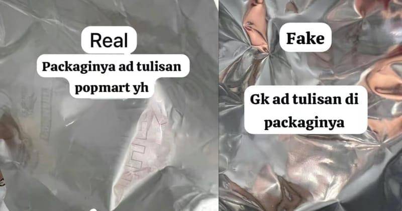 Perbedaan selanjutnya terletak pada bagian dalam kemasan. Pada labubu yang asli, terdapat tulisan "Pop Mart" yang tercetak jelas di bagian dalam packaging, sementara pada versi palsu, tulisan tersebut tidak ada.
