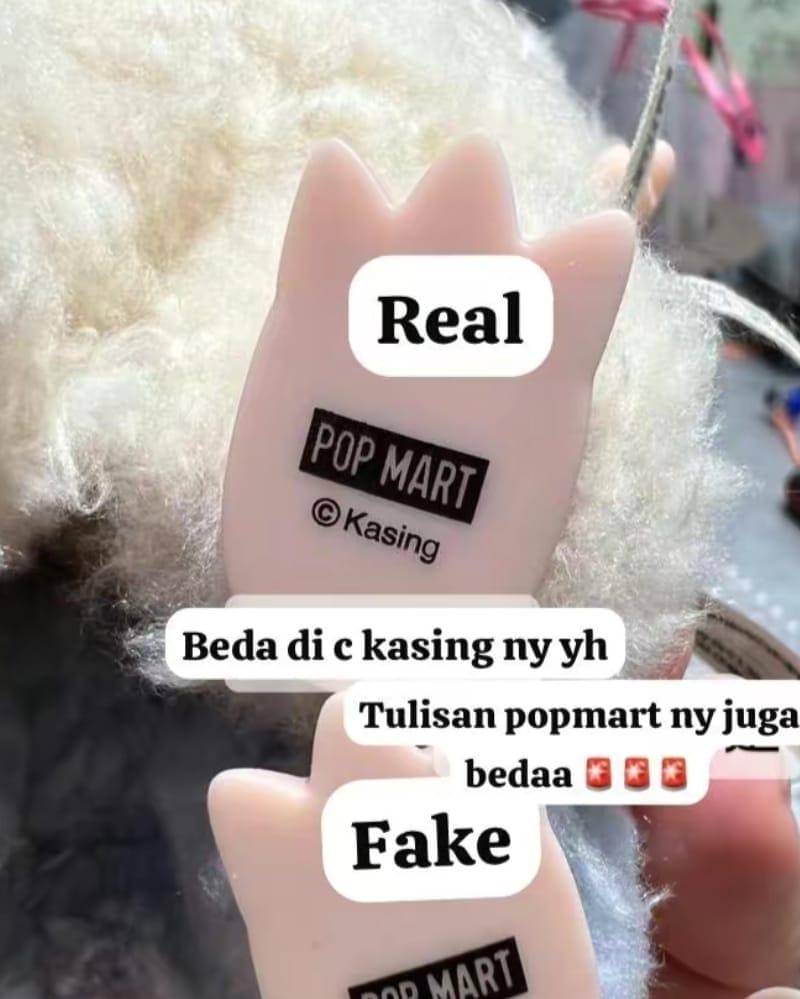 Selain itu, tulisan "Pop Mart" pada labubu asli juga berbeda dibandingkan dengan yang palsu, baik dari segi font maupun kualitas cetakannya.