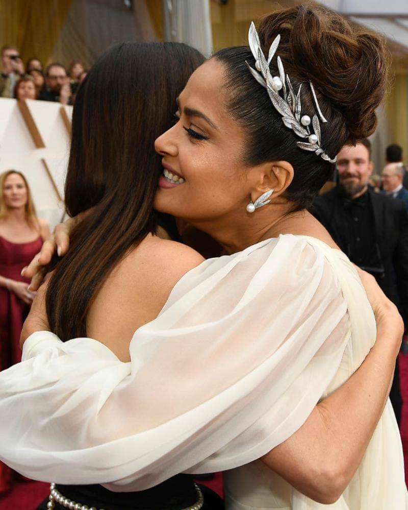 Salma Hayek mengenakan kalung berlian Boucheron dan mutiara Laut Selatan yang mewah sebagai tiara, mengingatkan kembali penampilannya di karpet merah sebelumnya. Ia memadukan hiasan kepala unik itu dengan anting-anting mutiara dan berlian yang serasi, menegaskan kembali keyakinannya bahwa Academy Awards adalah acara yang ideal untuk perhiasan yang mewah.