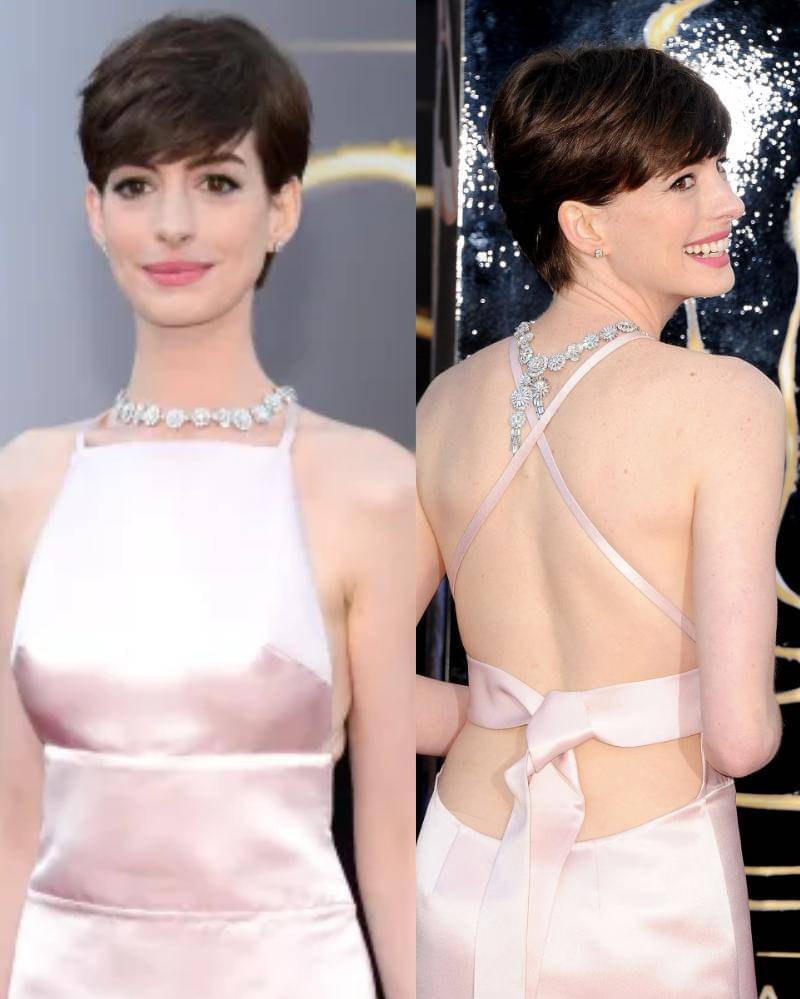 Penampilan Anne Hathaway di Oscar 2013 untuk "Les Miserables" adalah sebuah studi tentang kesederhanaan yang elegan. Sebuah gaun Prada berwarna merah muda lembut, anting berlian yang halus, dan kalung berlian Tiffany & Co. yang memukau menghiasi punggungnya dengan anggun, mencerminkan detail tali gaun yang rumit.