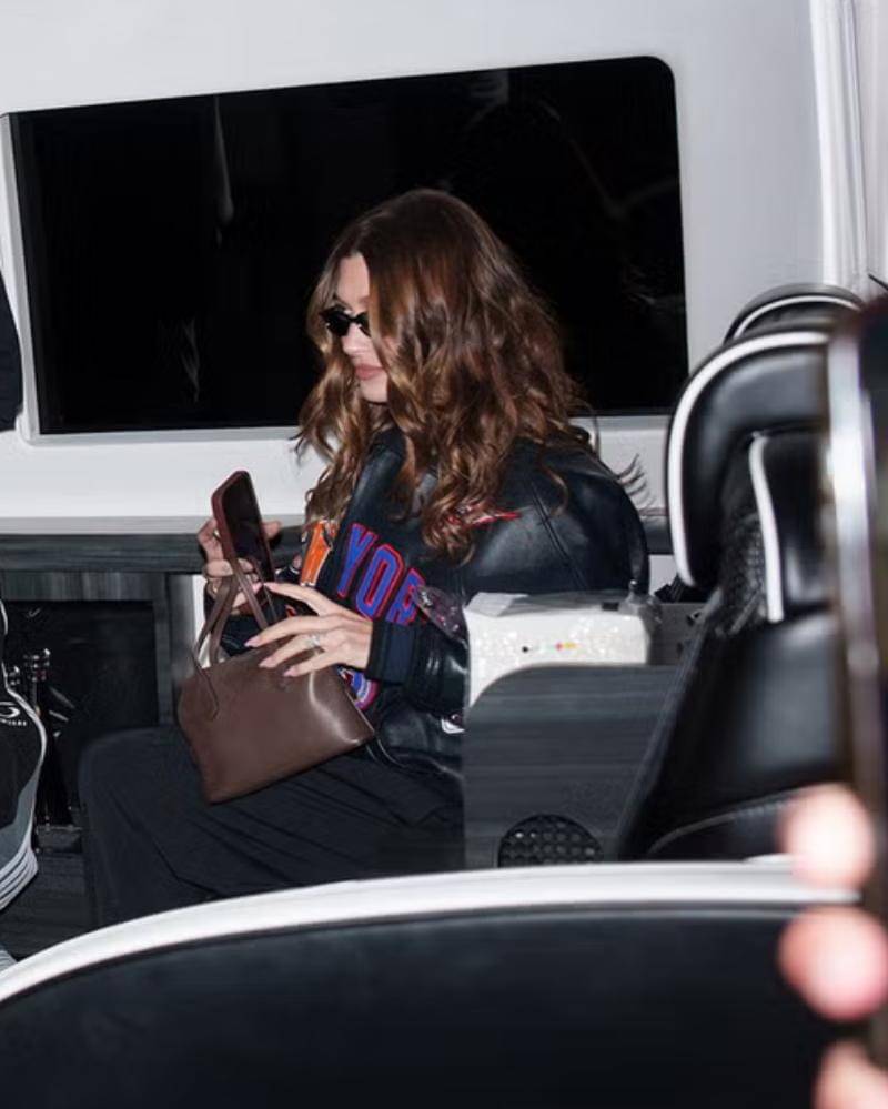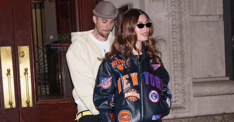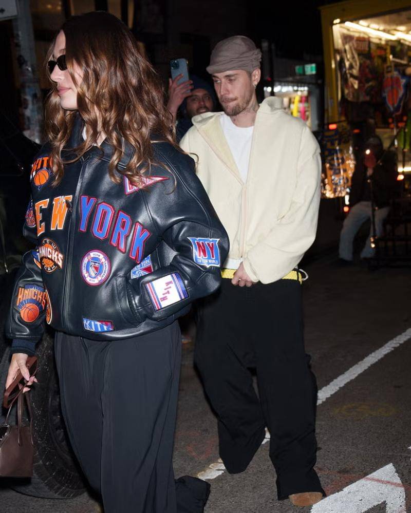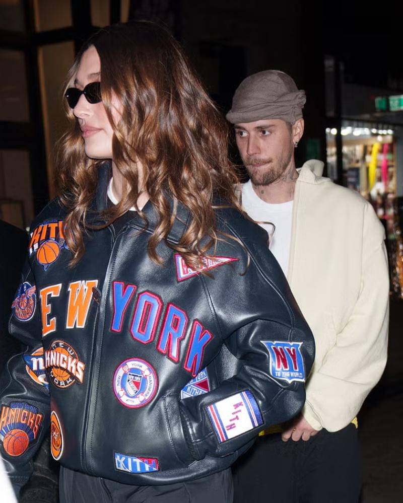 Hailey Bieber menunjukkan dukungannya terhadap New York Knicks dengan mengenakan jaket bomber hitam berbahan kulit. Kesan trendi terlihat dari hiasan berbagai macam patch menarik. Pakaian luar yang modis ini merupakan hasil kerja sama antara Avirex dan Kith, pengecer ternama di New York City, yang kemungkinan memengaruhi pilihan Hailey untuk mengenakannya selama berada di kota tersebut.