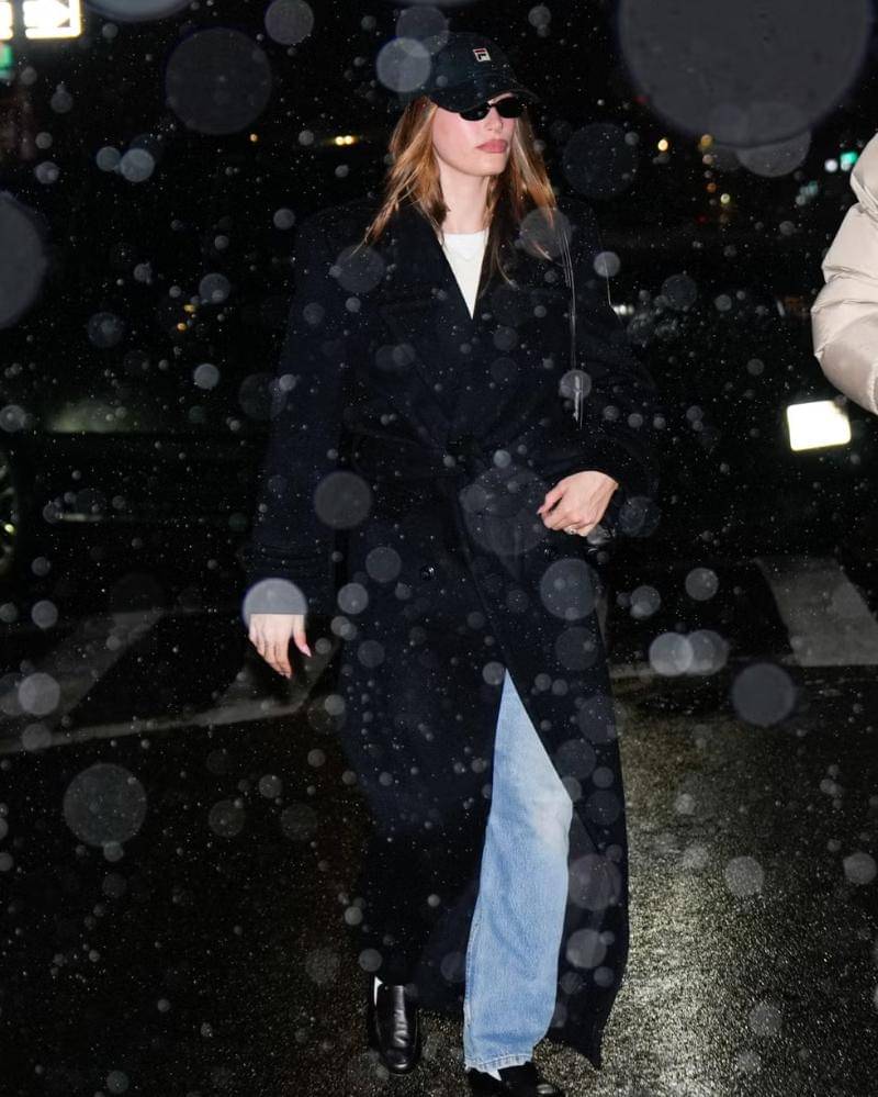 Pada hari Minggu itu juga, Hailey Bieber semakin menonjolkan gaya sportynya dengan pakaian kasual namun tetap anggun. Ia mengenakan mantel panjang hitam klasik di atas kaus putih sederhana dan celana jeans santai berwarna terang.