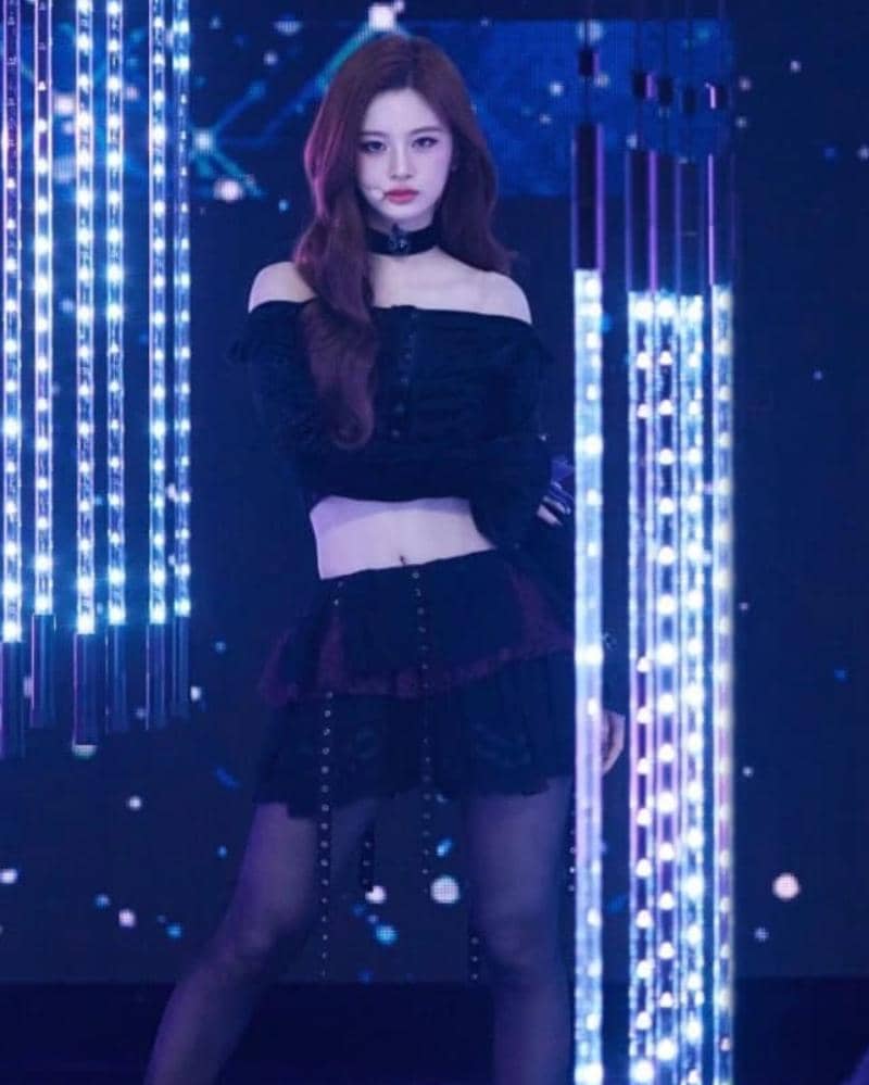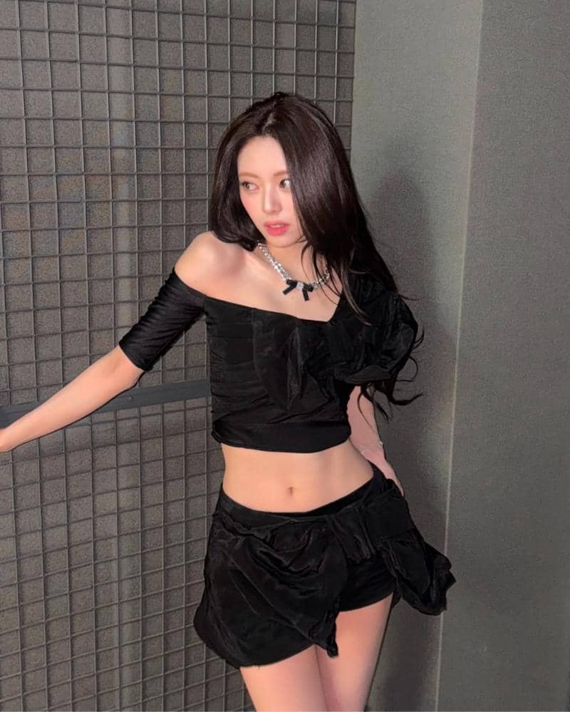 Sullyoon dari NMIXX juga tidak kalah memberikan pesona khas dirinya. Ia terlihat mengenakan two piece outfit, yang terdiri dari cropped sabrina top, dengan lengan terompet. Detail kancing di bagian tengah pakaiannya menambahkan kesan manis, pada busana serba hitam tersebut.
