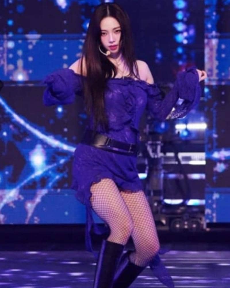 Berbeda dengan Yuna dan Sullyoon yang mengenakan busana serba hitam, Karina tampak mengenakan busana berwarna ungu. Bergaya sabrina juga untuk menjaga kekompakan, mini skirt Karina menggunakan bahan lace yang menambahkan kesan mewah. Sementara, stocking jaringnya memberikan tampilan kekinian para anak muda zaman sekarang.
