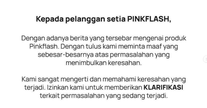 "Kepada pelanggan setia Pinkflash, dengan adanya berita yang tersebar mengenai produk Pinkflash, dengan tulus kami meminta maaf yang sebesar-besarnya atas permasalahan yang menimbulkan keresahan. Kami sangat mengerti dan memahami keresahan yang terjadi," tulis Pinkflash di Instagram.