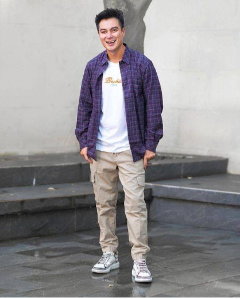 Dalam beberapa kesempatan, Baim Wong terlihat tampil dengan gaya yang lebih casual layering. Ia menggunakan kemeja flanel sebagai outer dan kaus putih sebagai dalamannya. Kombinasi ini dipadukan dengan celana kargo yang memberikan kesan tangguh.