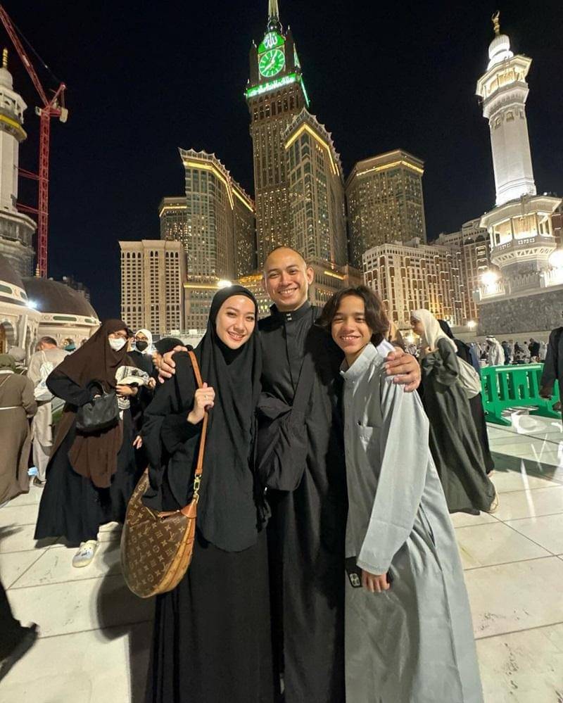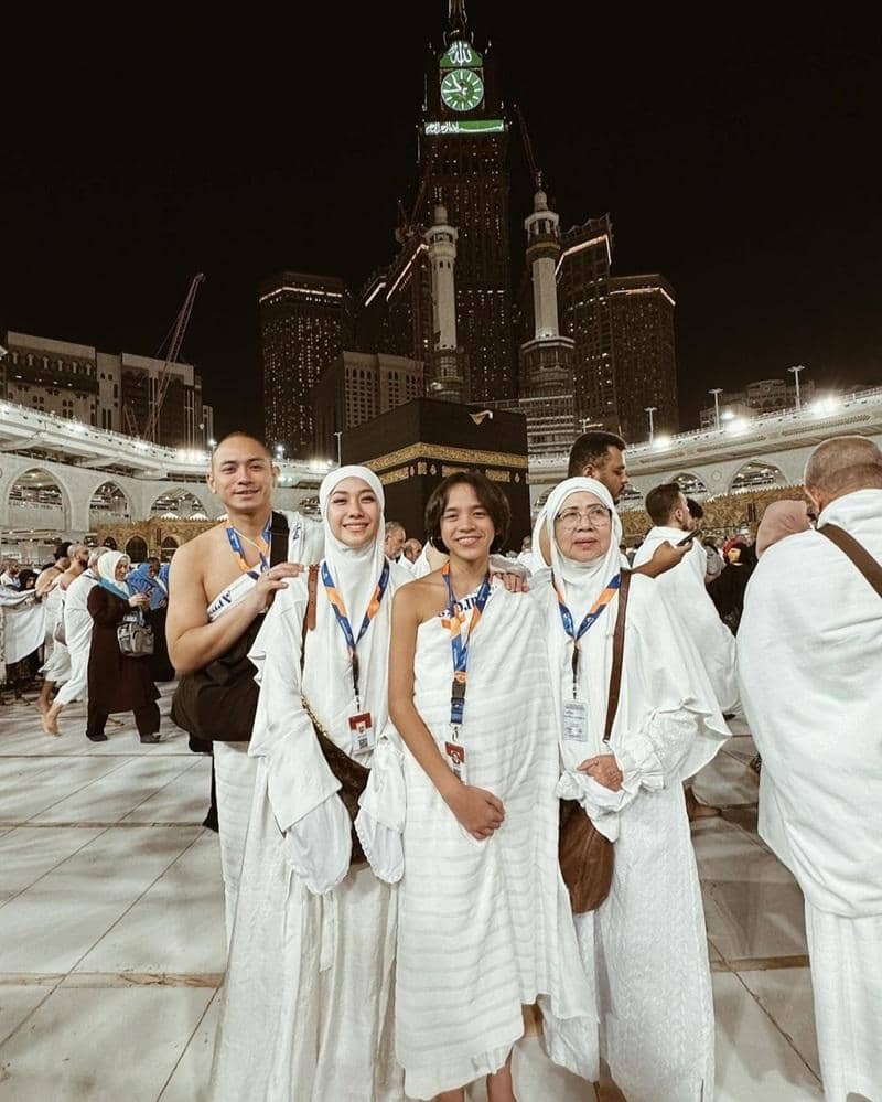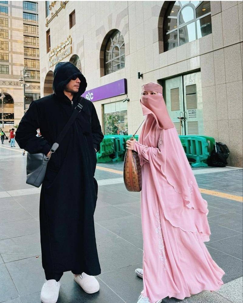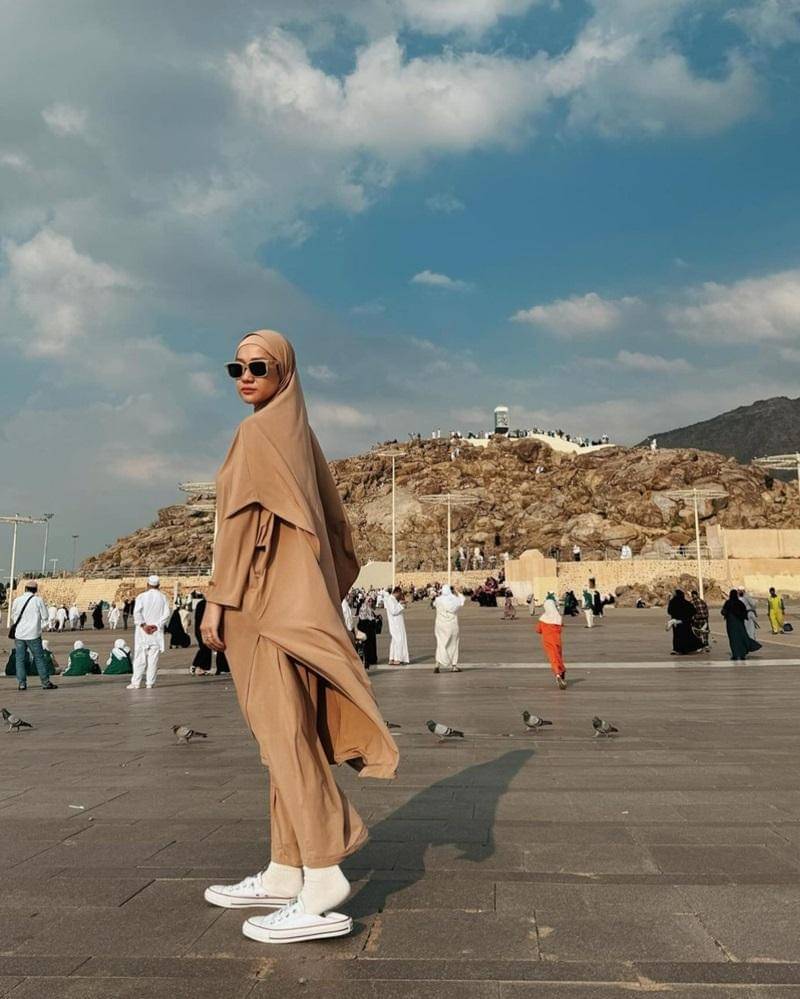 Di bahunya, tersampir tas LV yang jadi pilihannya selama umrah. Sementara itu Tiko mengenakan gamis laki-laki berwarna hitam dan Noah mengenakan gamis berwarna abu-abu terang.