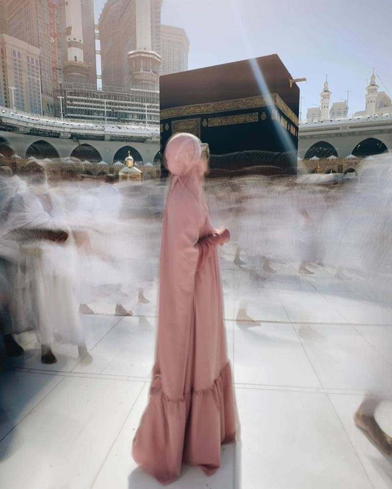 Kali ini, ia mengenakan pakaian serba putih lagi, outfit yang banyak dipilih para jamaah saat menjalankan ibadah umrah.