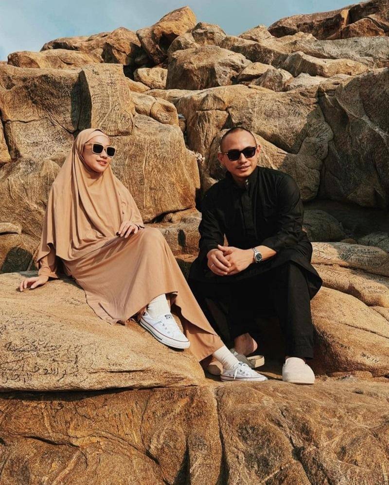 Kemudian, ia dan sang suami berfoto di atas bebatuan di Arafah. Karena Tiko mengenakan outfit hitam, hasil fotonya pun terlihat mengagumkan.