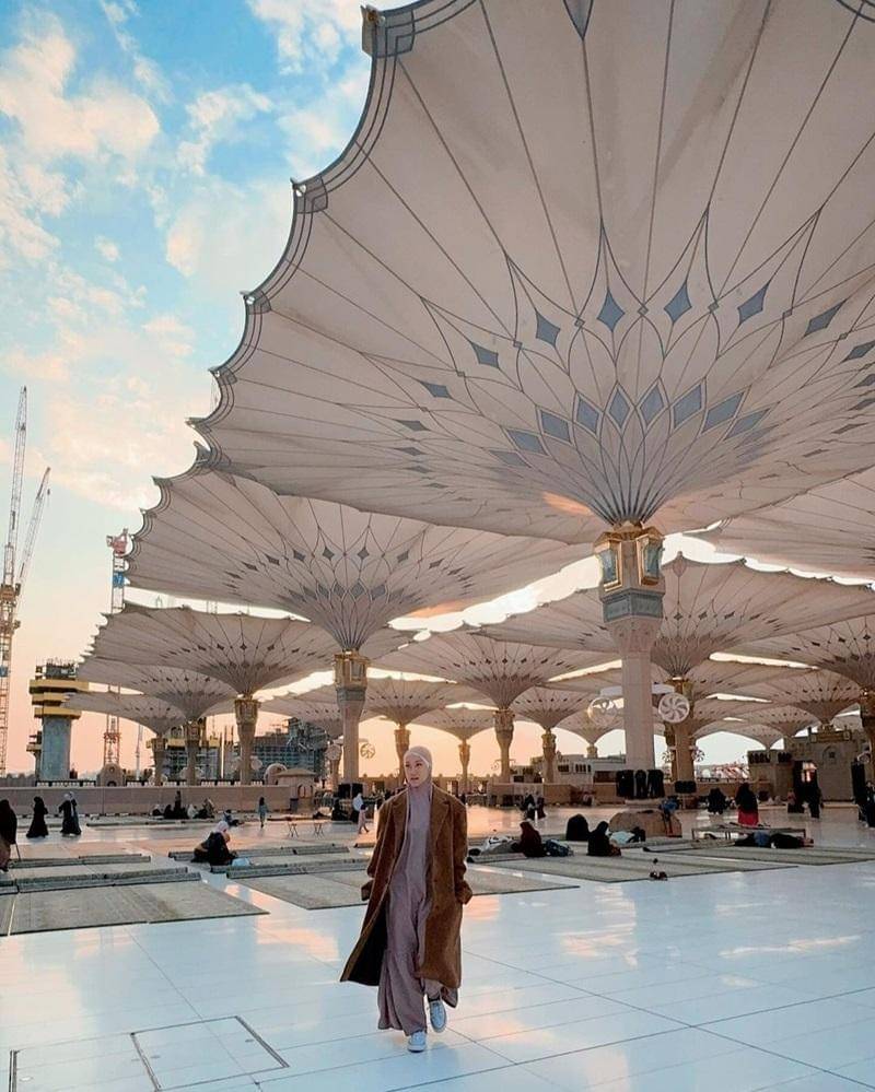 Madinah adalah kota yang tenang dan sangat indah. Salah satu waktu terindah di Kota Nabi ini adalah saat pagi dan sore. Unge menyempatkan diri berfoto di pelataran Masjid Nabawi pasca salat Subuh.